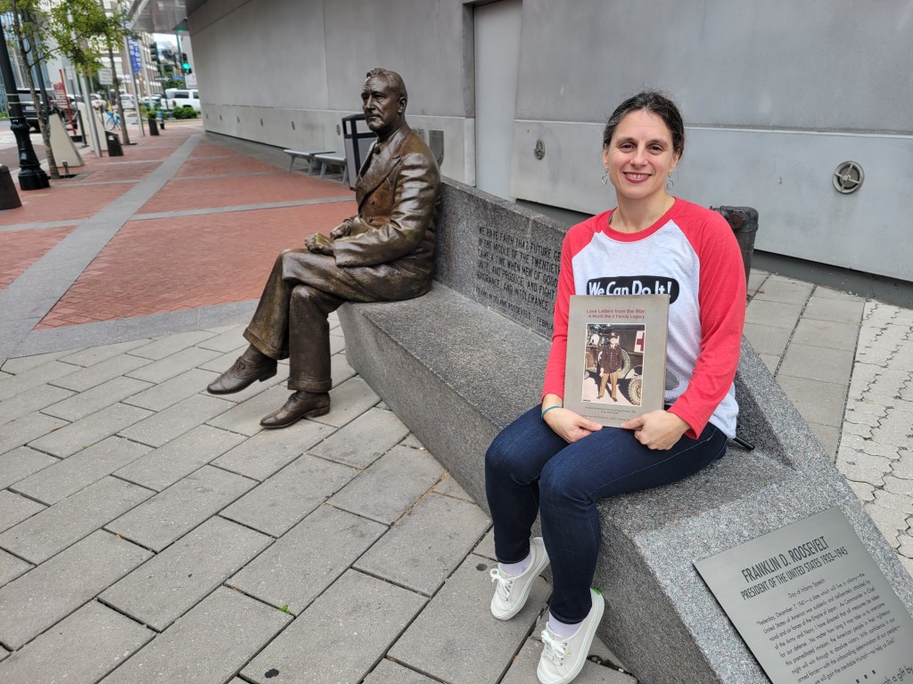 On the second day, I wore my Rosie the Riveter “We Can Do It” shirt that I had bought the day before. I stood in front of a bench with a statue of FDR and waited for it to be unoccupied so I could get a picture with the album. There was an older woman sitting on the bench. She was clearly emotional. I wondered what her story was. I wanted to ask her, but also felt that she was clearly having a moment that was for her that I didn’t want to invite myself into. She looked at me and then tugged on her shirt to indicate that she was looking at my shirt. She nodded with a warmth, an approval and was clearly appreciating that I was wearing it. I nodded back to her and smiled. She was welling up with tears and I felt I participated in her moment in whatever way she needed. I was so very curious to hear her story, but let the moment go by, feeling that the communications in silence and gestures was more meaningful than any verbal exchange could be. She and her husband went to get an arriving Uber and I managed to get a spot on the bench and get a few good pictures.