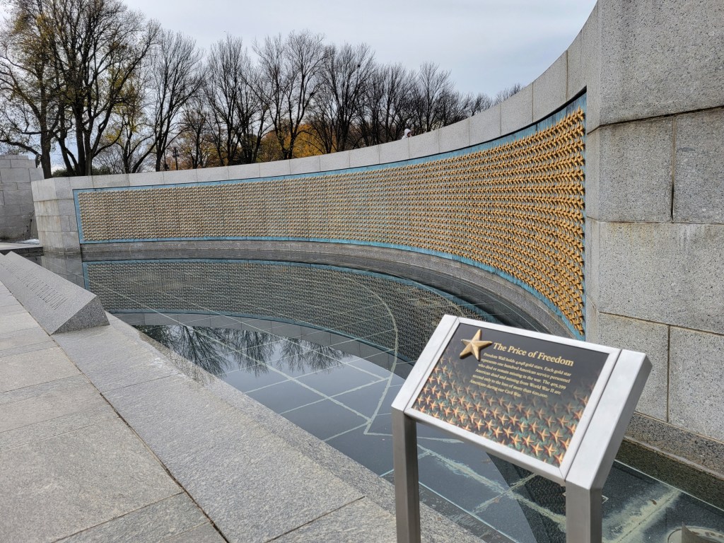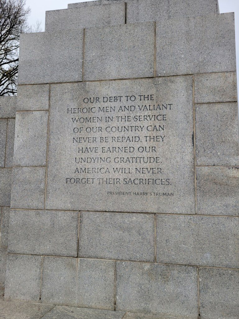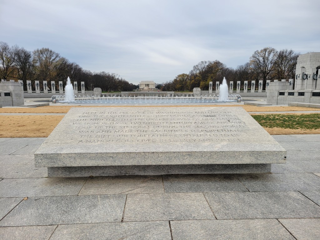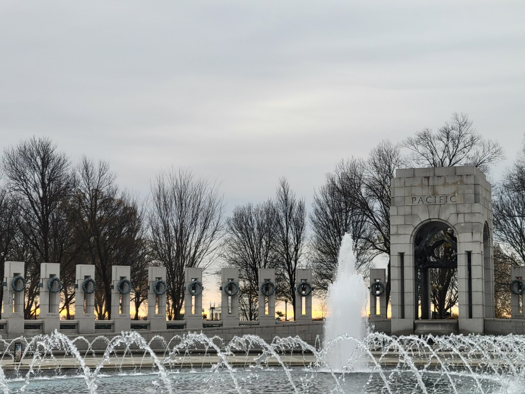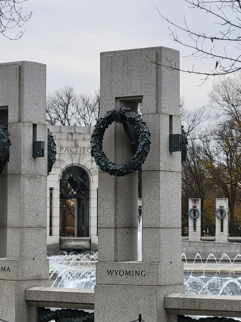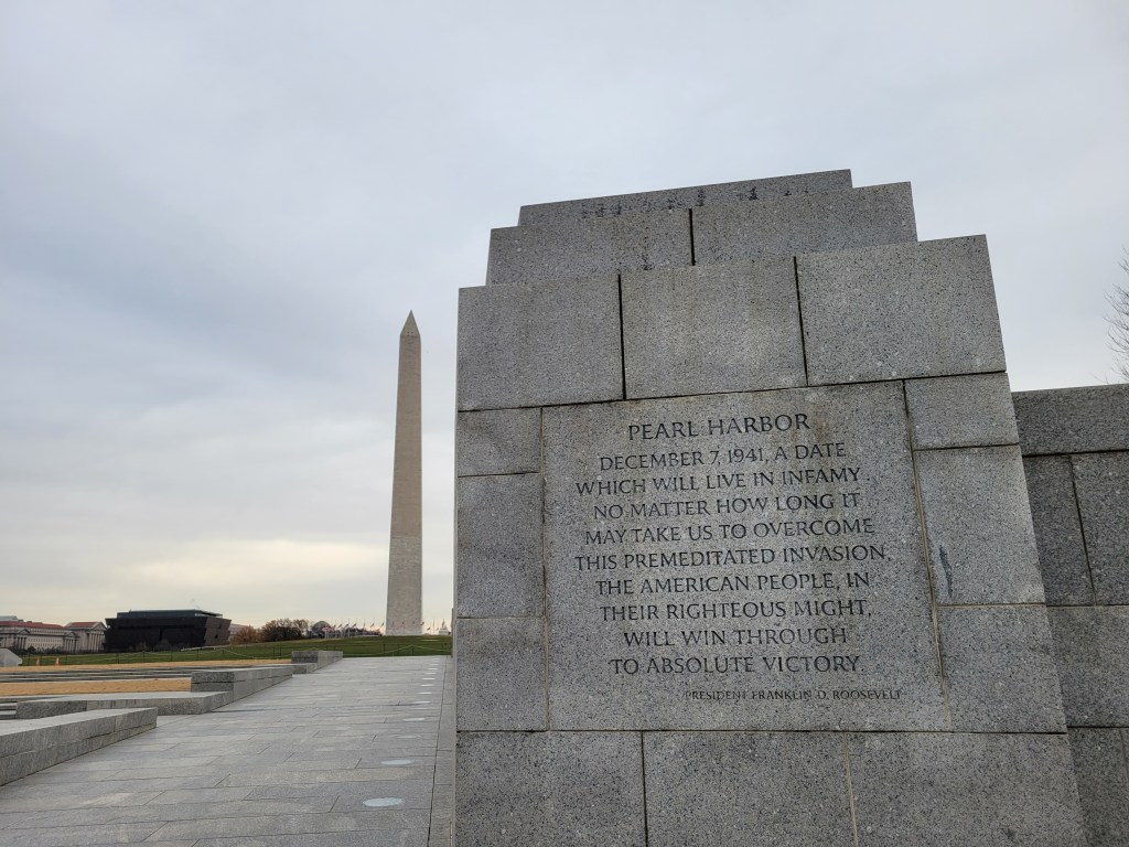 I have been to the World War II memorial many times throughout my life, but this time was different. This time, with 5 weeks of immersive input and study invested, I understood it all in a whole new way. I knew what all the engravings meant, what happened in most of the places named and the bigger meaning behind the quotes and those who were saying them. For me, personally, it was a big round period at the end of a long paragraph of my own journey these last 5 weeks, and these last 25 years to develop a greater appreciation for what all of these stones were commemorating. I’ve lived my whole life with a deep, though abstract, appreciation for the importance and meaning of that time in recent history, but this was the first time I felt like I really earned my place to be at that memorial. For me, it was a solemn experience and definitely the way I had hoped to spend December 7th.