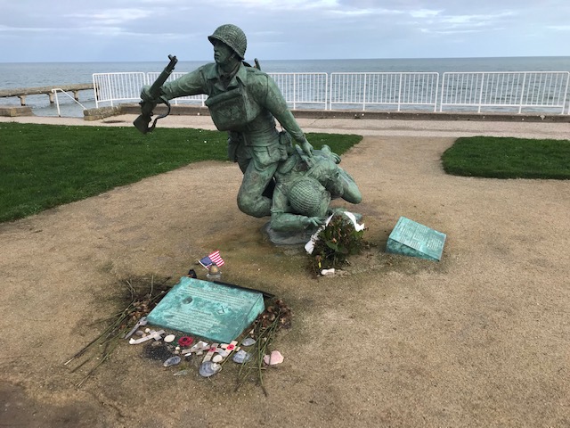 But, like all the monuments built all over this coastline and inland, what I was there for was firmly planted in the front of my mind and the emotions started stirring and flowing. I have thought about this beach countless times throughout my life. It has, for me, been the most jaw dropping of events to comprehend amidst the many hard to really imagine elements and happenings of World War II. The amount of courage and strength that thousands of young men, boys really, displayed to even be in those boats let alone run out of them – I can hardly comprehend. I have lived my life not only in a state of unending gratitude but total and complete awe thinking about that fact and that moment. What have I been willing or able to compel myself to do simply because it was the right thing to do? What have I done because somewhere in a land far away, a madman was on a murderous rampage and I was going to put myself in such dire circumstances to stop it? Well, to the second question, nothing. To the first, as much as I could, but nothing that even approximates an equal dedication, courage and self-sacrifice. I have always tried to do what I can to be a decent moral person living in a time where just knowing what is and is not the decent thing is much more complex and nuanced than such a harsh reality as the one of that time and the choice to be on this beach during it. Many life issues have grey areas, multiple valid viewpoints and nuances to consider. This one was fairly black and white. Or, at least as my world view goes. But even then, until Pearl Harbor, there was as much debate and multiple perspectives and division amongst them as any since. I am reading a book now called Those Angry Days that describes the voracious debate that raged in America about whether or not to enter the war when it started in Europe in 1939. As I read it, I find myself empathizing with different arguments and seeing similarities in other seemingly intractable debates throughout history since and of today, where there is often not an issue of who is right and who is wrong, but an issue of how well or differently the situation is or is not understood and what matters most to each person. Isolationists did not want to sacrifice their American sons in a bloody war happening far away. Interventionists ALSO did not want American sons to die and so horribly, but they thought stopping that madman was more morally and practically “worth” such an awful cost or at least necessitated it. This once complex and nuanced equation was eventually made horrifically simple as events progressed. The stakes eventually became clearly as high as they could possibly be. More and more opinions fell into the interventionist camp as the true gruesome vision of those on the assault became more and more clear. By the time Paris fell, more and more Americans began to see how horrific and unambiguous it all was. And after Pearl Harbor was hit and the Americam illusion of being “far away” from the reaches of such conquering, violent hungers was destroyed, overnight, the complexity of the debate instantaneously shrank to zero and an entire country, our entire country’s emotion was simplified into one united and distinct voice. I do hold out hope that such empassioned unity does not necessitate only such horrific disaster to take shape, but I am glad that when such a darkened motive did force its will upon the world, it did. So the sacrifices were eventually decided to be “worth it”, if anything really could be “worth” such costs, not just by the country, but by those heroic men and women themselves that made the decision, enthusiastically and unequivocally, to enlist and put their own lives wholeheartedly on the line so that we could live ours in peace and freedom. None knew at the moment of enlisting that they would end up on those boats, about to hurl themselves forward into utter and brutal disaster, but they knew they were walking into something where death would be waiting around every corner. The stakes were as high as they could be and so were the costs of almost any decision made. But they made their decisions and they made them decisively.