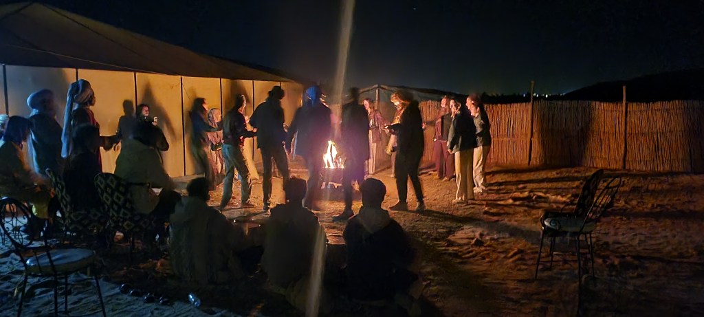 From there, we hopped on camels and rode (from at least 7 feet in the air!) our way into the sunset amidst the Saharan dunes. We slept the night in a desert camp and danced around a campfire to a rousing drum circle with 35 of our newest friends from all over the world, France, Italy, Portugal, Slovenia, China, Japan, Peru and, of course, Morocco.
