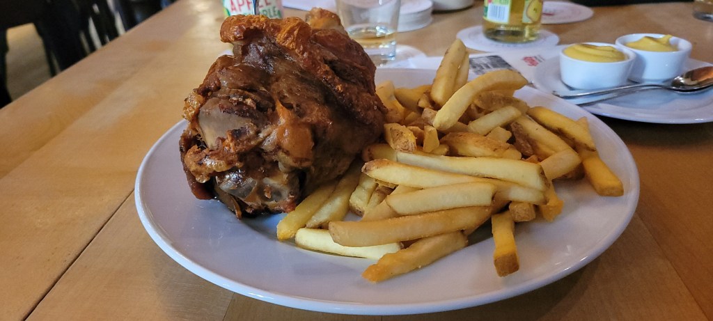 Ich habe viel leckeres deutsches Essen gegessen – Wurst, Schweinshaxe, Sauerkraut, Kartoffeln.